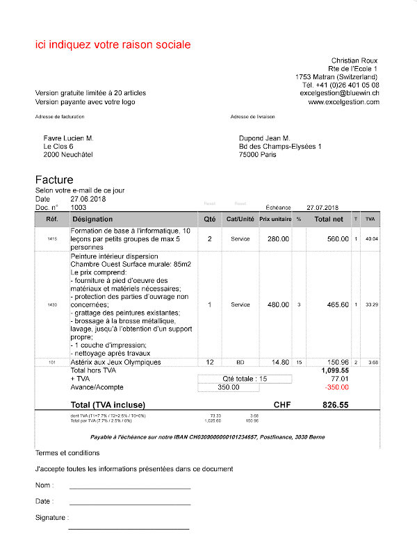 Excelgestion billing template XLSX file compliant Android-iOS-PC