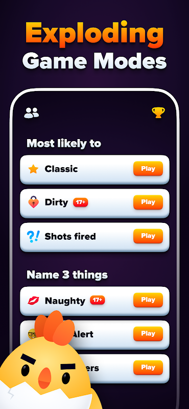 Exploding Chicken offers different game modes like Most Likely To, Name 3 Things, or Grammar Nazi.