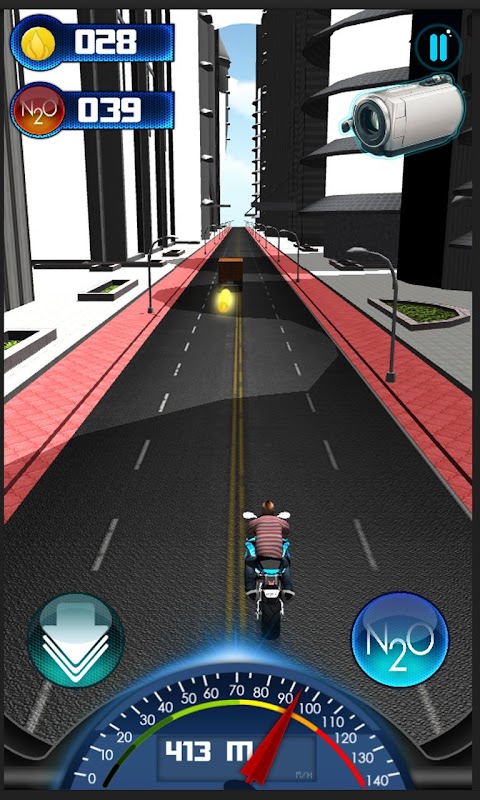 As you collect coins, you get a little nitro refill for your nitro cylinder installed in your super bike. The nitro can also be refilled by over taking the cars really close. Close calls will also awards points.