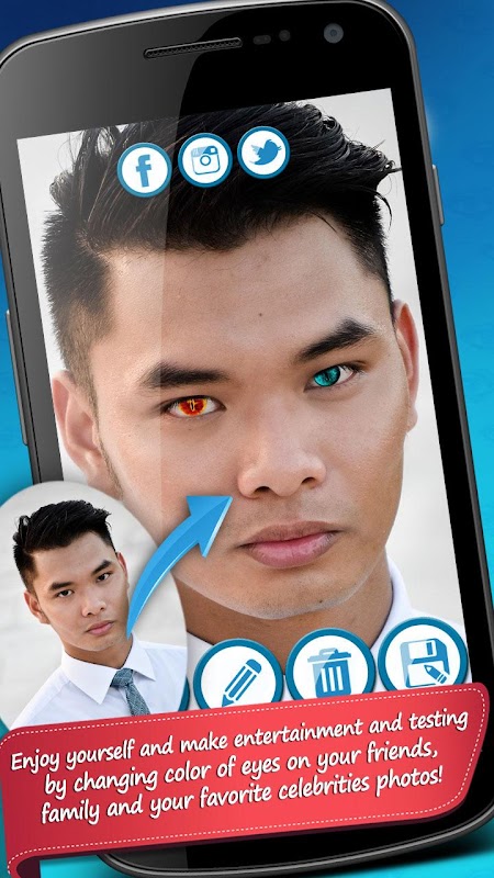 Amaze your friends with your image manipulation skills. Let your imagination come to life and make ''HD quality pictures'' with this ''photo booth camera''. Practice your image editing skills and amaze everyone with your creativity! The simple design of this smartphone app will let you make HD phone wallpapers in a second! Have a photo makeover studio at the palm of your hand! It doesn't matter if you don't have light colored eyes, this ''image editor'' will work for every eye color. With our unique blending technique you will look like you've had an eye color change surgery! Add different custom stickers and you will have different colored eyes. Make an awesome photo gallery with our realistic photo effects! Enhance your selfies with this free photo montage app!