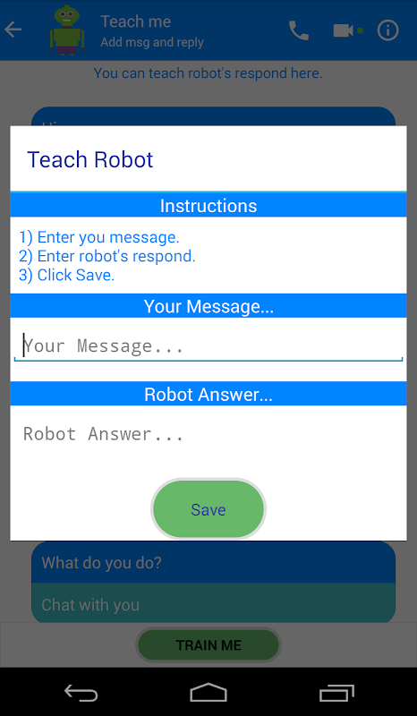 หุ่นยนต์ตัวนี้ไม่สามารถตอบสนองต่อข้อความของคุณได้โดยไม่ต้องสอนเขา คุณต้องสอน chatbot นี้ เมื่อคุณสอนเขามันจะตอบข้อความทั้งหมดของคุณในขณะที่คุณสอนเขา