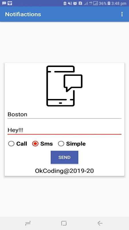 In this app you can write your custom title and your custom description and on just pressing send button get your notification received.