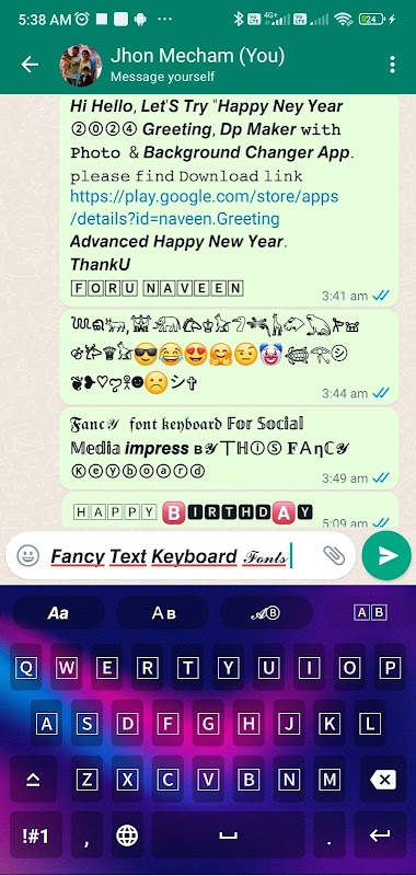 ขอแนะนำ Fancy Text Keyboard แอพขั้นสุดยอดสำหรับยกระดับประสบการณ์แชทบนโซเชียลมีเดียของคุณ ด้วยคอลเลกชันแบบอักษรแฟนซี อีโมจิ สีทึบ และธีมที่หลากหลาย คีย์บอร์ดแฟนซีช่วยให้คุณปรับแต่งบทสนทนาในแบบของคุณอย่างแท้จริงและทำให้มันโดดเด่น ไม่ว่าคุณจะส่งข้อความบน WhatsApp, Facebook, Instagram หรือ Twitter หรือแม้แต่เพิ่มแฮชแท็กและคำบรรยายลงใน Instagram/Snapchat Stories ของคุณ Fancy Keyboard คือคู่หูที่สมบูรณ์แบบสำหรับการแสดงออกถึงความเป็นตัวคุณอย่างมีสไตล์ ใช้ประโยชน์จากคุณสมบัติพื้นหลังที่กำหนดเองของแอปเพื่อปรับแต่งสภาพแวดล้อมการแชทของคุณเพิ่มเติม สร้างความประทับใจไม่รู้ลืมด้วยคีย์บอร์ดทุกที่ที่คุณเลือกเขียน