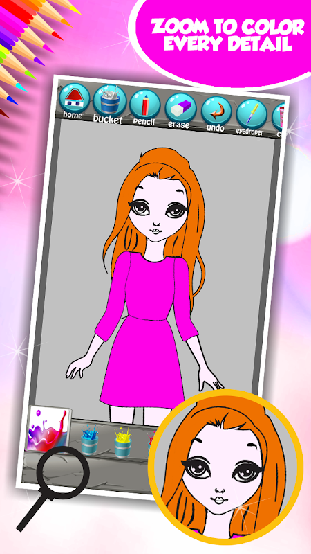 Explore the magnificent top outfits and they may give you an idea what to wear and for which occasion. There are also sensational hairstyles so do not think twice but browse the coolest sketches and express your creativity. Download free the latest Fashion Girl Coloring Book app on your phone and you will be enchanted with the loveliest lady wearing casual dress in combination with flip-flops and wide brim floppy hat. There are suitcases next to her and it is obvious that she has just arrived at the beach of the tropical island for a magnificent vacation. Imagine that you are her and click the paint bucket and fill the gaps of this wonderful drawing. Make the best photo and use it to decorate your tablet and show how much you care about your style. This coolest game is intended both for children and adults so do not be shy because you are an adult, but play it. There is no reason not to get the popular fashion girl coloring application as it will also surprise your kids with magnificent illustrations.