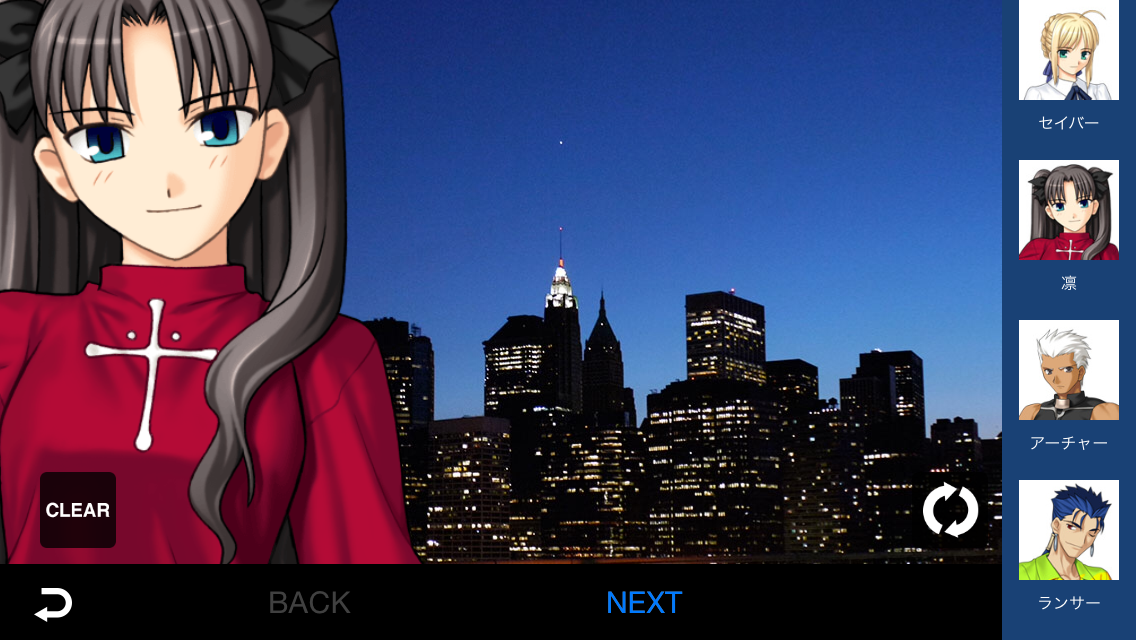 作中に登場するキャラクターや台詞を合成できるカメラアプリです。セイバー、アーチャー、カレンなど、人気キャラクター総勢7名が登場。