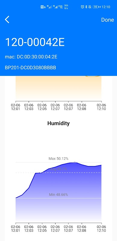 A temperature and humidity APP based on Beacon research and development, displays the current device name, mac address, temperature, humidity, power, signal strength, and can view historical data through a line graph; the gateway page displays the added gateway device, display name, mac address, Signal strength, add and edit gateways via Bluetooth scanning.