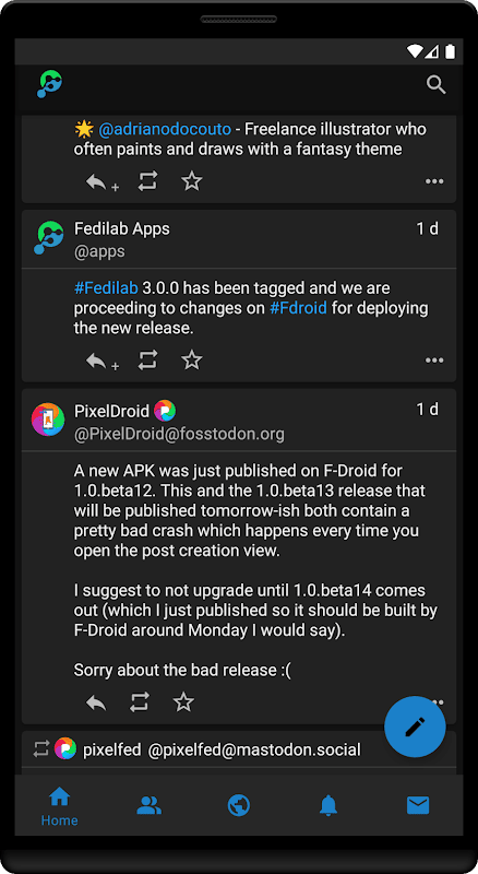 Fedilab เป็นไคลเอนต์ Android แบบมัลติฟังก์ชั่นในการเข้าถึง Fediverse แบบกระจาย ซึ่งประกอบด้วยไมโครบล็อก การแชร์รูปภาพ และการโฮสต์วิดีโอ