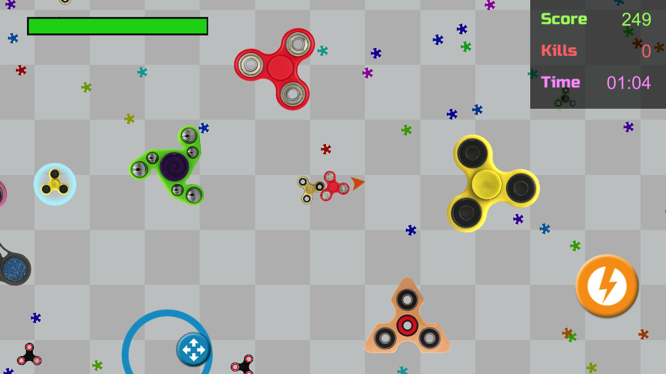 ขยับฟิดเจ็ตสปินเนอร์ของคุณไปรอบๆ แล้วกินฟิดเจ็ตสปินเนอร์ตัวเล็กๆ เพื่อให้มันโตขึ้น หลีกเลี่ยงฟิดเจ็ตสปินเนอร์ตัวใหญ่ที่จะไล่ตามและกินคุณ เพิ่มพลังให้ฟิดเจ็ตสปินเนอร์ของคุณด้วยการใช้พลังงานในช่วงเวลาที่เหมาะสม เมื่อคุณถูกฟิดเจ็ตสปินเนอร์ตัวใหญ่กิน เกมก็จบลง! คุณสามารถเลือกฟิดเจ็ตสปินเนอร์ตัวโปรดของคุณได้จากเกม