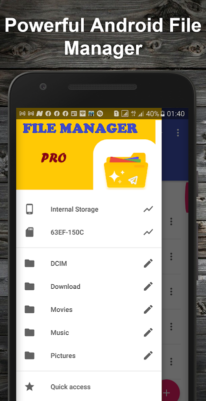 It supports every file management actions (open, search, navigate directory, copy and paste, cut, delete, rename, compress, decompress, transfer, download, bookmark, and organize). File Manager Pro supports media files and major file formats including apk.
