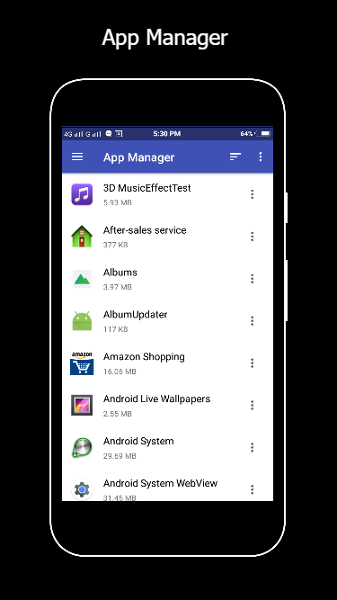 • Apps: You can see all applications introduced in your nearby gadget. You can stop or erase applications. You can erase information or money of applications. You would backup be able to your application as apk record moreover.