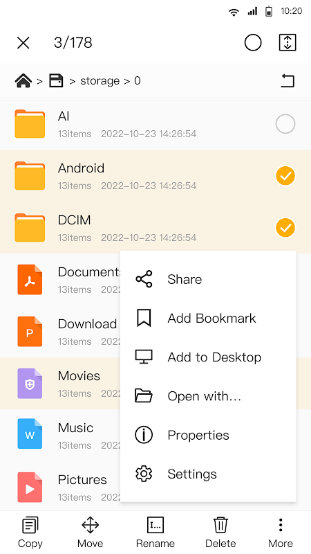 รองรับการดำเนินการจัดการไฟล์ทุกรูปแบบ (เปิด ค้นหา นำทางไดเร็กทอรี คัดลอกและวาง ตัด ลบ เปลี่ยนชื่อ บีบอัด ขยายขนาด ถ่ายโอน ดาวน์โหลด บุ๊กมาร์ก และจัดระเบียบ) สำหรับรูปแบบไฟล์ต่างๆ รวมถึงสื่อและ apk