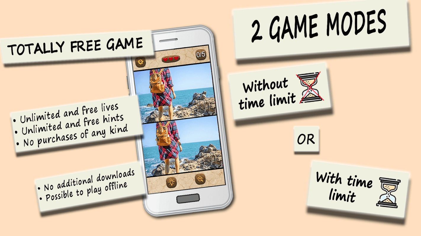 เกมนี้เล่นฟรีได้ง่ายแต่ท้าทายสำหรับจิตใจของคุณเมื่อคุณพยายามค้นหาความแตกต่าง จุด 5 ความแตกต่างระหว่างสองภาพเพื่อให้งานและความคืบหน้าเสร็จสมบูรณ์ คุณสามารถขยายภาพที่น่าทึ่งเพื่อดูวัตถุที่ซ่อนอยู่ได้ดีขึ้น เหมาะสำหรับทั้งเด็กและผู้ใหญ่