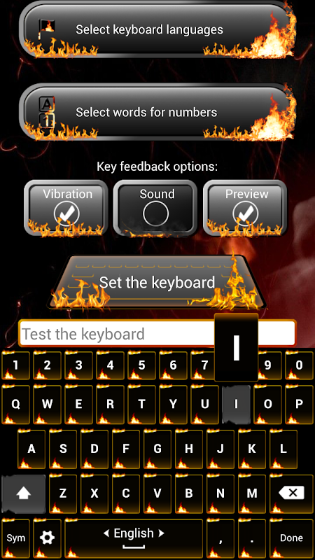 Make your mobile phone shine bright with magic flames glistening in the dark night that this smoking hot fire keypad offers. Amazing texting experience is at hand with red keyboard free of charge – prepare your fingers for the sizzling hot key board and see how cool it can be to send an SMS message! One of the best free apps for Android lets you pick the French, German, Italian, Spanish or English keypad pro for free, create shortcuts, pick the keypad sounds and enjoy in the exquisite flamy keyboard color. Make SMS text messaging fun again with this amazing fiery typewriter for tablet devices and phones. Feel the heat radiating from your smartphone with this fire theme. One of the best fire keyboard themes will illuminate your phone screen with amazing flames, completely free of charge!