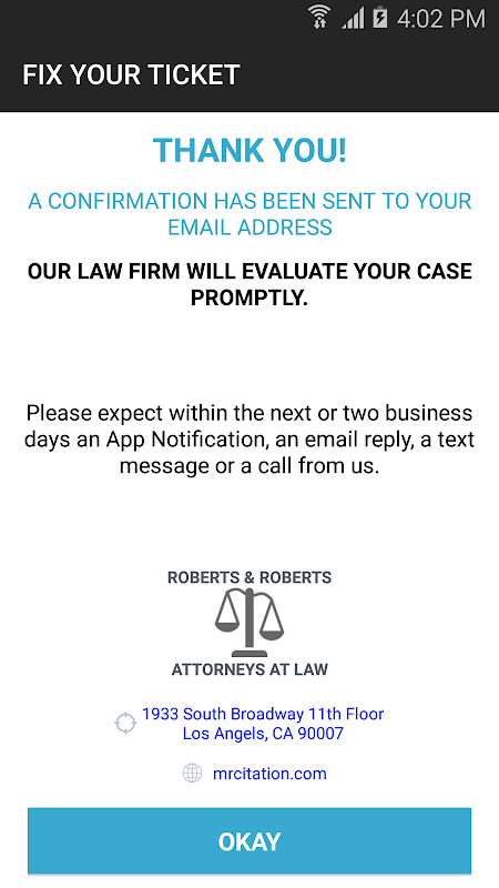 ยินดีต้อนรับ! การแก้ไขTicket®ของคุณ Roberts & Roberts A บริษัท กฎหมายมืออาชีพ เมื่อใช้แอพนี้คุณจะสามารถตรวจสอบสถานะคดีของคุณถ่ายภาพตั๋วของคุณประกาศศาลใด ๆ ใบขับขี่ของคุณเอกสารอื่น ๆ ที่เกี่ยวข้องกับการอ้างอิงของคุณและส่งถึงเราโดยตรงเพื่อตรวจสอบ ภายในหนึ่งหรือสองวันเราจะติดต่อคุณทางแอพแจ้งเตือนอีเมลข้อความหรือโทรศัพท์