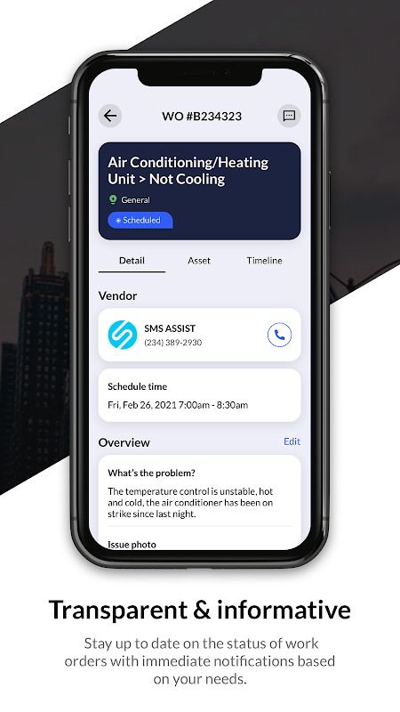 · รับทราบข้อมูล: รับข้อมูลอัปเดตตามเวลาจริงเกี่ยวกับสถานะคำขอการบำรุงรักษาของคุณ รวมถึงกำหนดเวลาการซ่อมแซม ใครจะเป็นผู้ดูแล และดูว่าคุณต้องการข้อมูลเพิ่มเติมหรือไม่