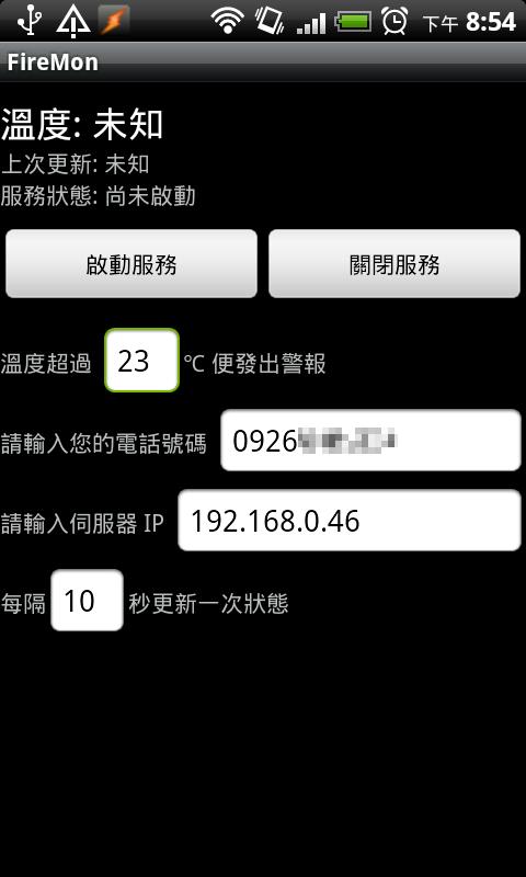 本 App 會透過 TCP/IP 讀取 FLAG-1605A 實驗版偵測到的溫度, 當溫度過高時手機會振動並發出警報。