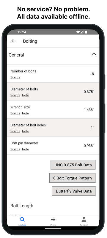 2. ค้นหาข้อมูลทันที เพียงป้อนข้อมูลที่จำเป็น (เช่น ขนาดท่อที่ระบุและคลาสหน้าแปลน) แล้วแอปจะเติมค่าที่ถูกต้องสำหรับเอาต์พุตหน้าแปลน ท่อ หรือโบลต์ที่คุณกำลังค้นหาทันที