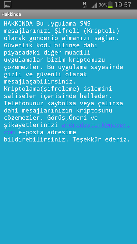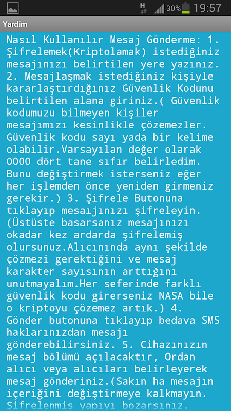 วิธีใช้การส่งข้อความ: 1. เขียนข้อความที่คุณต้องการเข้ารหัสในตำแหน่งที่ระบุ 2. กรอกรหัสความปลอดภัยที่คุณตกลงกับบุคคลที่คุณต้องการส่งข้อความในช่องที่ระบุ (ผู้ที่ไม่ทราบรหัสความปลอดภัยของเราไม่สามารถถอดรหัสข้อความของเราได้ รหัสความปลอดภัยอาจเป็นตัวเลขหรือคำก็ได้ ได้ตั้งค่า 0000 โดยมีศูนย์สี่ตัวเป็นค่าเริ่มต้น หากคุณต้องการเปลี่ยนแปลง คุณต้องป้อนใหม่ก่อนการทำธุรกรรมแต่ละครั้ง) 3. คลิกที่ปุ่ม "เข้ารหัส" และเข้ารหัสข้อความของคุณ (หากคุณกดซ้ำๆ แสดงว่าคุณ จะเข้ารหัสข้อความของคุณหลายครั้ง อย่าลืมว่าผู้รับจะต้องถอดรหัสในลักษณะเดียวกันและจำนวนอักขระข้อความจะเพิ่มขึ้น หากคุณป้อนรหัสความปลอดภัยที่แตกต่างกันในแต่ละครั้ง แม้แต่ NASA ก็ไม่สามารถถอดรหัสการเข้ารหัสนั้นได้อีกต่อไป) 4. คุณสามารถคลิกที่ "ส่ง" ปุ่ม " และส่งข้อความโดยใช้สิทธิ์ SMS ฟรีของคุณ 5. ส่วนข้อความในอุปกรณ์ของคุณจะเปิดขึ้น ส่งข้อความโดยระบุผู้รับ (อย่าพยายามเปลี่ยนเนื้อหาของข้อความ คุณจะทำลายโครงสร้างที่เข้ารหัส ข้อความของคุณไม่สามารถถอดรหัสได้) การรับข้อความ : 1. คลิกปุ่ม "อัปเดต" สีน้ำเงินเพื่อนำเข้าข้อความใหม่เข้าสู่โปรแกรม 2. เมื่อคลิกลูกศรลง คุณจะเห็นข้อความขาเข้าของคุณในรายการและเลือกข้อความที่คุณต้องการ (ข้อความใหม่ล่าสุดอยู่ด้านบน) 3. กรอกรหัสความปลอดภัยที่ผู้ส่งกำหนดสำหรับข้อความนั้นในช่องที่เกี่ยวข้อง 4. คุณสามารถถอดรหัสข้อความและทำให้สามารถอ่านได้ด้วยปุ่ม "ถอดรหัส" (คุณสามารถส่งอีกครั้งในรูปแบบที่เข้ารหัสหรือไม่เข้ารหัส [open SMS] ได้ด้วยการคลิกเพียงไม่กี่ครั้ง หากคุณต้องการ เราเป็นหนี้บุญคุณ การเลือกเรา