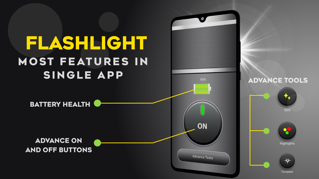 Let’s have powerful flashlight in your pocket. Get flashlight plus extra features like compass, sos, multiple screen colours and battery information. Now keep LED Torch in your pocket as a useful tool. Our torch light gives you a quick access to the torch.