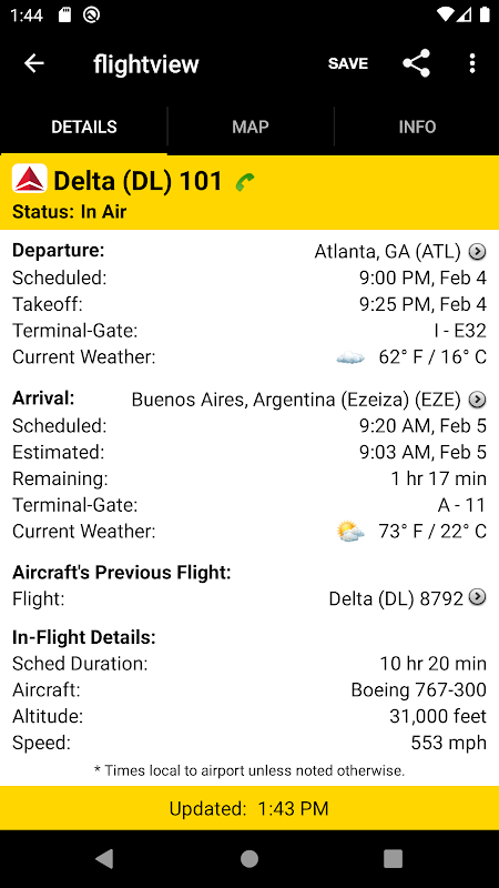 • การเดินทางจะซิงค์ระหว่างอุปกรณ์ต่างๆ และกับ www.FlightView.com เพื่อให้คุณตรวจสอบสถานะได้อย่างรวดเร็วทุกที่