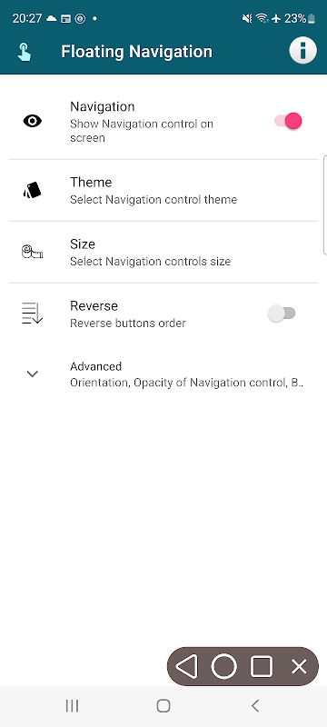 แอปพลิเคชั่น "การนำทางแบบลอย" สามารถแทนที่ปุ่มที่ไม่ทำงานและเสียของมือถือของคุณด้วยแถบการนำทางที่นุ่มนวลบนหน้าจอของคุณ หากคุณมีปัญหาในการใช้ปุ่มหรือแผงแถบนำทางของโทรศัพท์ทำงานไม่ถูกต้อง แอปพลิเคชันนี้เหมาะสำหรับคุณ ติดตั้งแอปพลิเคชันนี้และทำตามคำแนะนำเพื่อเปิดใช้งานแถบนำทาง