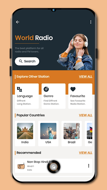 • ด้วยแท็บค้นหา ผู้ใช้สามารถค้นหาวิทยุ AM FM, วิทยุจูนเนอร์, วิทยุ FM, สถานี FM สด และวิทยุท้องถิ่นตามประเทศ ภาษา ประเภท และเครือข่าย