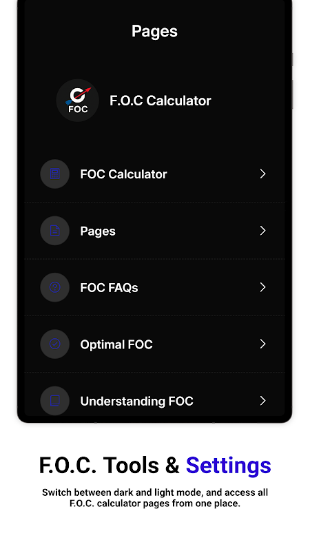 เอฟ.โอ.ซี. เครื่องมือและการตั้งค่า: สลับระหว่างโหมดมืดและโหมดสว่าง และนำทางไปยัง F.O.C. ที่แตกต่างกัน หน้าเครื่องคิดเลข