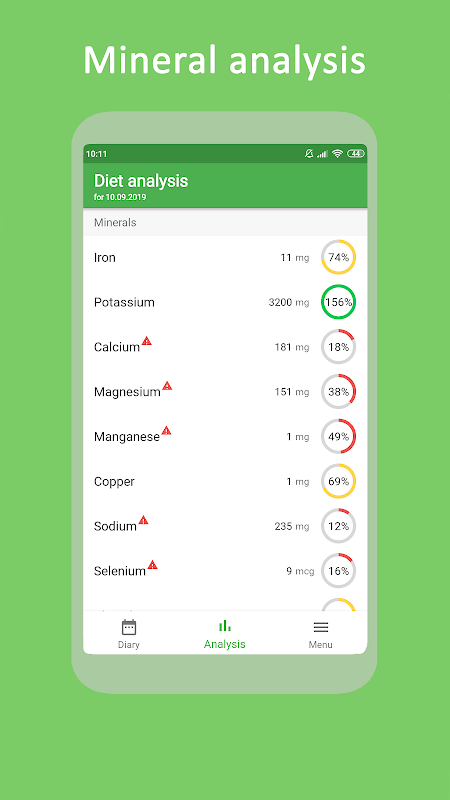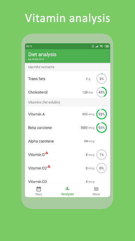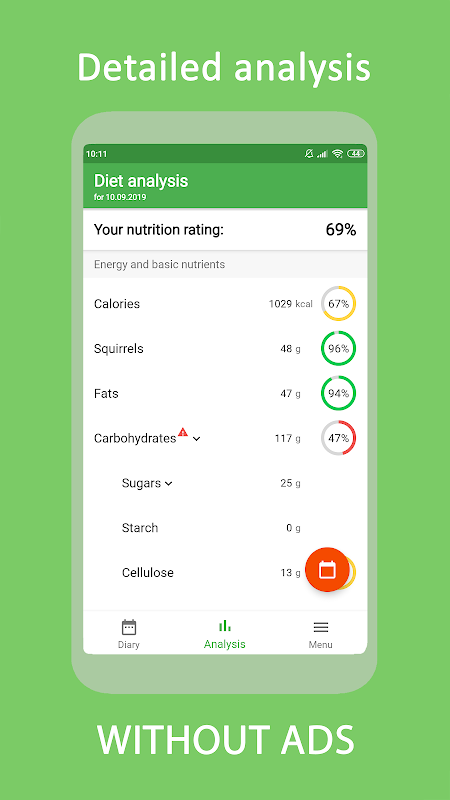 ไดอารี่อาหาร ไดอารี่จะถูกนำเสนอในรูปแบบของปฏิทินสลับไปมาระหว่างวันที่และเพิ่มอาหาร ไดอารี่จะแสดงค่าประมาณทางโภชนาการรายวันในรูปแบบของแผนภูมิวงกลมในสีที่ต่างกัน