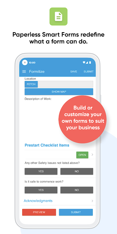 โมดูลรูปแบบสมาร์ททำงานร่วมกับหรือไม่มีการเชื่อมต่ออินเทอร์เน็ตและรวมถึงการสร้างแบบฟอร์มลากและวางเพื่อสร้างรูปแบบของคุณเองตามที่คุณต้องการด้วยคุณสมบัติอัจฉริยะมากมายเช่นการประทับเวลาและวันที่ตำแหน่ง GPS ลายเซ็นบนหน้าจอ เครื่องมือวาดภาพรวมการแปลข้อความเป็นเสียงฟิลด์ที่ต้องการค้นหาฐานข้อมูลและอื่น ๆ อีกมากมาย สร้างแบบฟอร์มของคุณเองหรือส่งอีเมลถึงเราแบบฟอร์มของคุณและเราจะสร้างแบบฟอร์มให้คุณ!