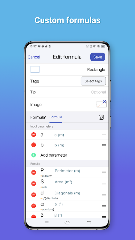 เครื่องคำนวณสูตรมาพร้อมกับสูตรการคำนวณในตัวที่หลากหลาย ช่วยให้คุณคำนวณให้เสร็จสิ้นได้ง่ายๆ โดยการป้อนพารามิเตอร์ที่ต้องการ นอกจากนี้ยังมีสูตรแบบกำหนดเองในตัวที่ตอบสนองความต้องการของแต่ละบุคคล เมื่อตั้งค่าสูตรที่กำหนดเองแล้ว คุณจะต้องป้อนพารามิเตอร์ระหว่างการคำนวณครั้งต่อไปเท่านั้นเพื่อให้ได้ผลลัพธ์อย่างรวดเร็ว ซึ่งจะช่วยปรับปรุงประสิทธิภาพ นอกจากนี้ คุณยังสามารถแชร์สูตรที่คุณกำหนดเองกับเพื่อนหรืออุปกรณ์อื่นๆ เพื่อการคำนวณที่สะดวก หลังจากเข้าสู่ระบบด้วยบัญชีของคุณ คุณสามารถซิงโครไนซ์สูตรที่คุณกำหนดเองกับคลาวด์เพื่อป้องกันการสูญเสียใดๆ นอกจากนี้ยังมีเครื่องคิดเลขวิทยาศาสตร์ที่ครอบคลุมซึ่งตรงกับความต้องการในการคำนวณที่หลากหลาย
