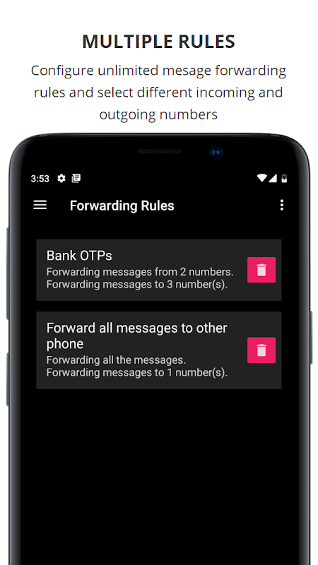 The app allows you to forward incoming SMS messages to any number in the world. You have the option to forward all the messages or some of them as per your needs. You can forward messages to multiple numbers also.