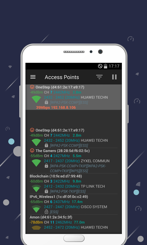 Optimize your WiFi network using “WiFi Analyzer” (open-source) by examining surrounding WiFi networks, measuring their signal strength as well as identifying crowded channels. Monitor strength of nearby wifi networks. Use to find a good location for your wifi hub. Or use to identify a channel with little overlap with neighboring networks. This wifi analyzer has many IP tools for monitoring your home or office's network signal info, wireless speed/strength, and mapping your network wired or wireless devices' on a graph! shows the signal strength of the currently connected wifi network. Also shows maximum, minimum and average values. Graph with auto-scale & speed options. This tool has an wireless network scanner (the wifi scanner) that will detect all the wifi hotspots in range, with either good or bad signal. The detected wireless networks are displayed in a list of wifi Analyzer network identifiers. List of all visible network access points to your device. Every row describes one network with its name, channel, security and signal strength. You can sort this list by every attribute and discover networks around you!