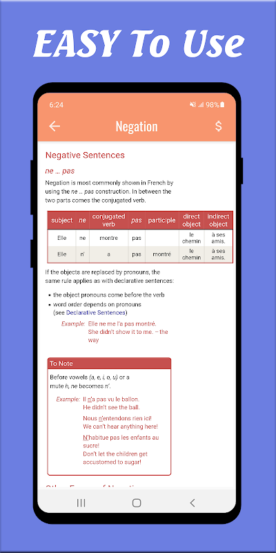 แอพได้รับการออกแบบและพัฒนาเพื่ออำนวยความสะดวกในการศึกษาไวยากรณ์ภาษาฝรั่งเศส ด้วยแอพพลิเคชั่นนี้ คุณสามารถเรียนภาษาฝรั่งเศสฟรีพร้อมบทเรียนมากกว่า 50 บทเรียนใน 8 หัวข้อหลัก