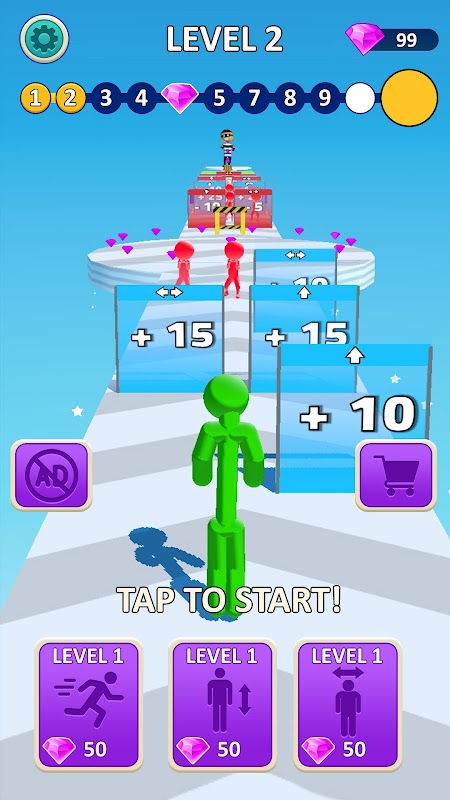 In tall man, your primary objective is to collect as many diamonds as possible while navigating through a variety of challenging obstacles and gates. Each diamond you run and collect adds to your score and contributes to your character's growth. As you accumulate diamonds, your character gradually becomes taller, making it easier to overcome obstacles and gates. The higher you grow, the more dynamic and intricate the runner hero game becomes, as new challenges and opportunities unfold.