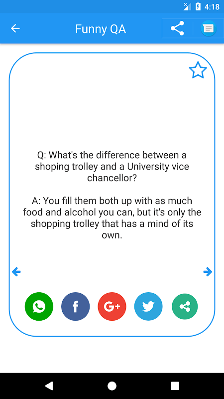 Funny Q&A 2018 (Funny Questions and Answers) app is finally here. It is an easy to use, practical, and funny app for your smart mobile phone. If you need something to cheer you up, simply install this crazy fun questions and answers application for free. Let’s put a smile on that face!