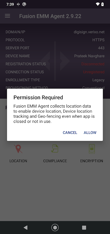 - Fusion EMM Agent รวบรวมข้อมูลตำแหน่งเพื่อเปิดใช้งานตำแหน่งอุปกรณ์ การติดตามตำแหน่งอุปกรณ์ & Geo-fencing แม้ว่าแอปจะปิดหรือไม่ได้ใช้งาน