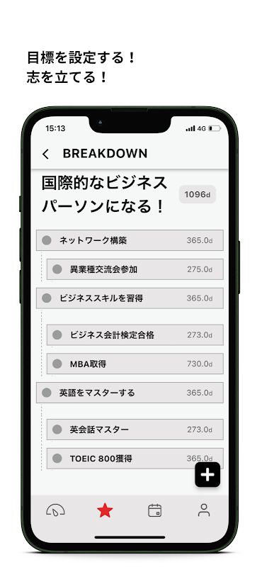 ในการเป็นนักธุรกิจระหว่างประเทศ ให้ใช้ฟังก์ชันการแบ่งเป้าหมายเพื่อกำหนดเป้าหมายและพัฒนาแผนปฏิบัติการ ((ตัวอย่าง: การได้คะแนน TOEIC 800, การได้มาซึ่ง MBA)