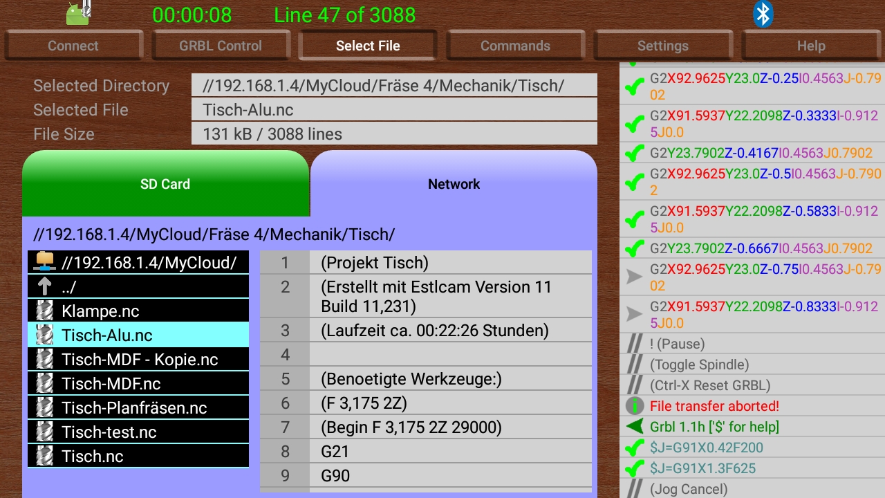 ด้วยแอพนี้คุณสามารถใช้งานเครื่อง GRBL CNC ของคุณได้จากแท็บเล็ตขนาด 10 "ของคุณการเชื่อมต่อถูกสร้างขึ้นผ่านบลูทู ธ ตัวรับที่ต้องการคือ HC-06 ซึ่งสามารถซื้อได้ในราคาต่ำกว่า 6 €คำแนะนำในการเชื่อมต่อมีอยู่ในหน้าวิธีใช้ใน แอป