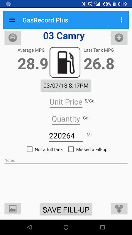 *Main screen includes current economy and average for the selected vehicle as well as all your fillup input. No menu selections to do a fillup.