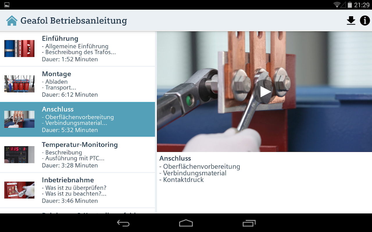 The GEAFOL-App provides operating instruction videos about Geafol transformers.