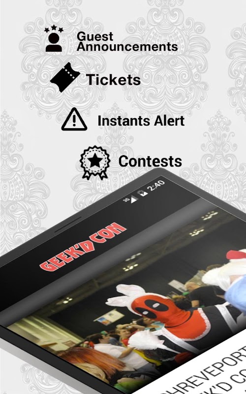 ตอนนี้คุณสามารถมีพลังของ Geek'd Con ในฝ่ามือของคุณด้วยแอปมือถือ The Geek'd Con! คุณจะได้รับข้อความประกาศจากแขกที่ส่งตรงไปยังอุปกรณ์ของคุณ นอกจากนี้คุณยังสามารถรับอัปเดตเกี่ยวกับตั๋วค้นหาข้อมูลการแสดงและข่าวทั้งหมดที่คุณต้องการ ผู้ขายยังสามารถค้นหาข้อมูลและลงทะเบียนผ่านแอพ