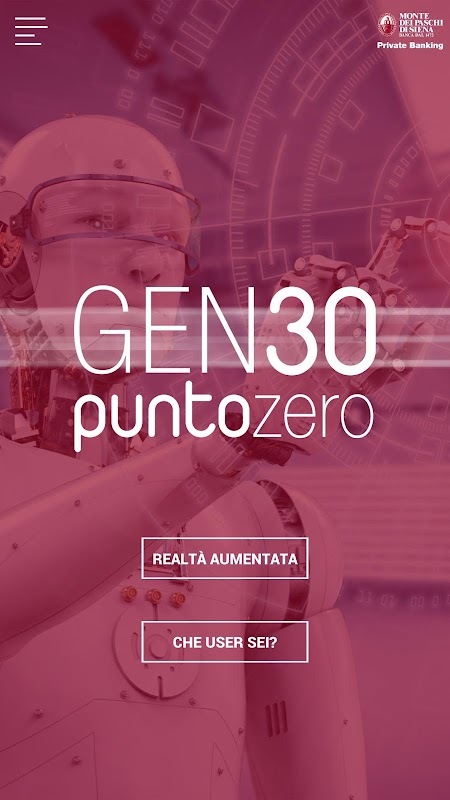 GEN30PuntoZero è un percorso conoscitivo nel mondo della Digital Transformation promosso da MPS Private Banking dedicato, in particolare, alla prima generazione nata nell’era dell’Intelligenza Artificiale e a tutti coloro che vogliono vivere, lavorare e investire ai tempi della trasformazione digitale. Tramite quest’app potrai fruire di alcune esperienze frutto dell’Intelligenza Artificiale, la Realtà Aumentata, ovvero la riproduzione di una realtà modificata in cui, alla oggettività percepita dalla nostra vista, vengono sovrapposte raffigurazioni e informazioni artificiali e virtuali.
