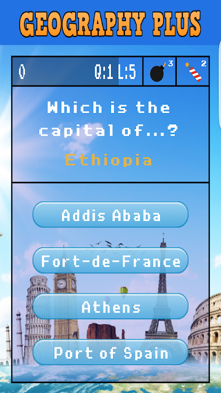 - เล่น: รับคะแนนโดยการตอบคำถามเกี่ยวกับเมืองหลวง ธง และข้อมูลอื่นๆ ของประเทศต่างๆ ให้ถูกต้อง คุณมีชีวิต 5 ชีวิต และเมื่อเกมจบลง คุณสามารถส่งบันทึกของคุณเพื่อเปรียบเทียบกับผู้เล่น Geography Plus คนอื่นๆ ได้