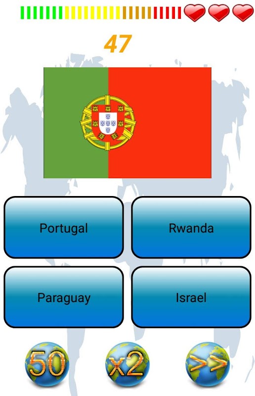 แบบทดสอบธงเป็นเกมสำหรับเด็กและผู้ใหญ่ที่ทดสอบความรู้ของคุณด้วยการตอบคำถามของธงนี้ การแข่งขันที่จะมีความรู้มากที่สุดภูมิศาสตร์ (ธงของประเทศของโลก) ตอบคำถามได้อย่างถูกต้องที่จะจุดคะแนนได้รวดเร็วยิ่งขึ้นคุณตอบจุดมากกว่าที่คุณทำมัน ในเกมที่คุณจะมีสามสัญลักษณ์ที่ 50% จุดพับและผ่านคำถาม