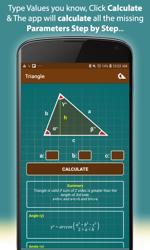 เพียงพิมพ์ค่าของพารามิเตอร์ที่รู้จักคลิกคำนวณและแอพจะแก้ปัญหารูปทรงเรขาคณิตสำหรับพารามิเตอร์ทั้งหมดที่ไม่ทราบค่าโดยใช้ฟังก์ชั่นตรีโกณมิติ