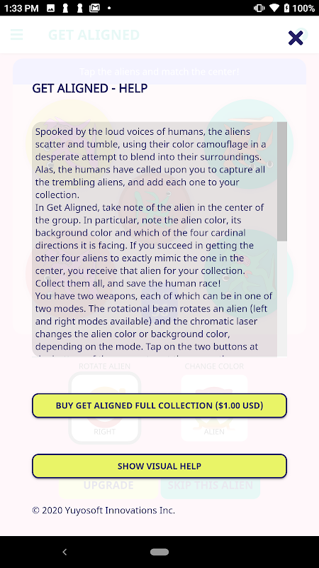 ใน Get Aligned ให้สังเกตคนต่างด้าวที่อยู่ตรงกลางของกลุ่ม โดยเฉพาะอย่างยิ่งให้สังเกตสีร่างกายของมนุษย์ต่างดาวสีพื้นหลังและทิศทางใดในสี่ทิศทางที่สำคัญที่มันหันไป หากคุณประสบความสำเร็จในการทำให้เอเลี่ยนอีกสี่ตัวเลียนแบบตัวที่อยู่ตรงกลางคุณจะได้รับเอเลี่ยนตัวนั้นสำหรับคอลเลกชันของคุณ รวบรวมพวกมันทั้งหมดและช่วยเผ่าพันธุ์มนุษย์!