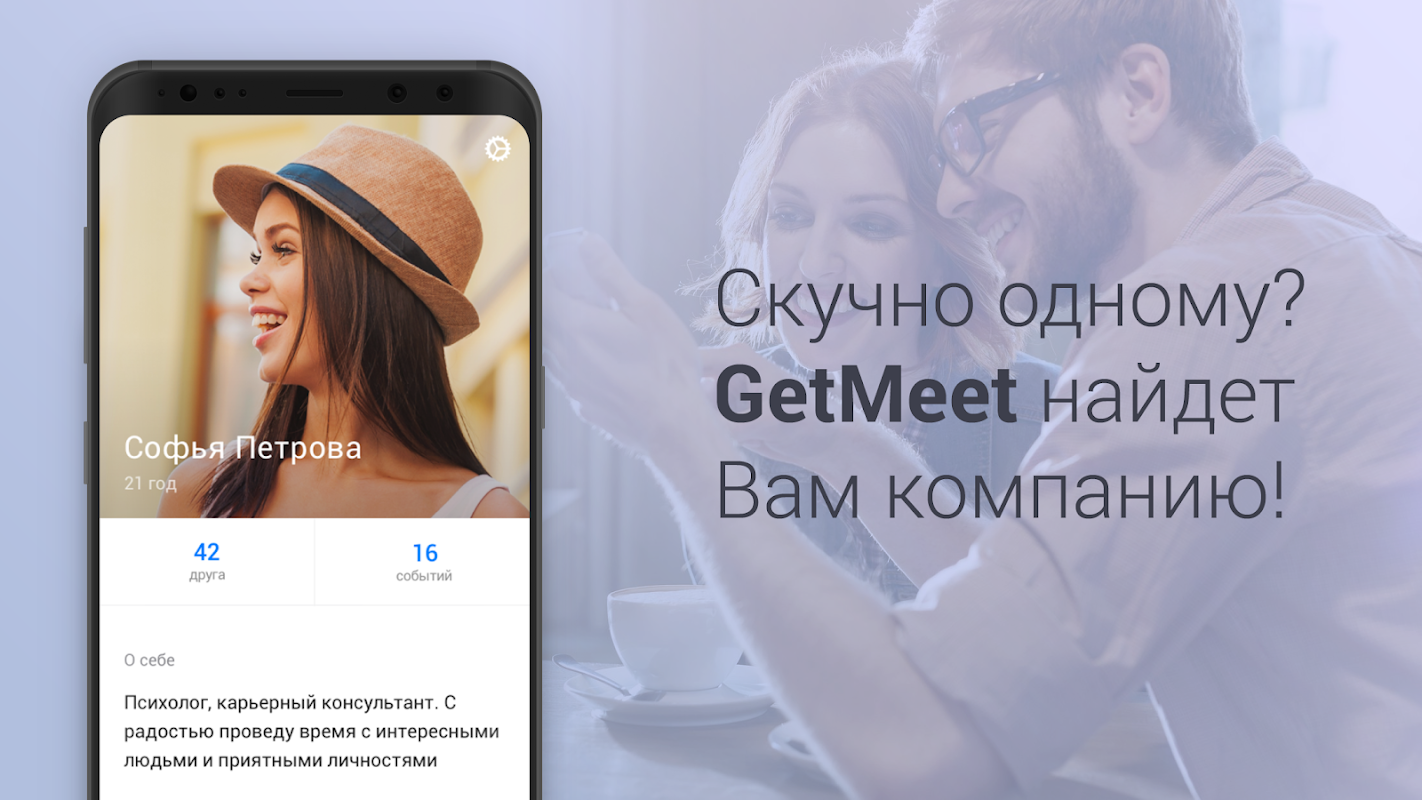 Мы знаем как всем надоели «стандартные» приложения для знакомств. GetMeet – уникальный формат. Найти приятного собеседника и компаньона, для совместного посещения интересных событий очень просто, но самое главное без всего того, что вам надоедает в приложениях для знакомств!
