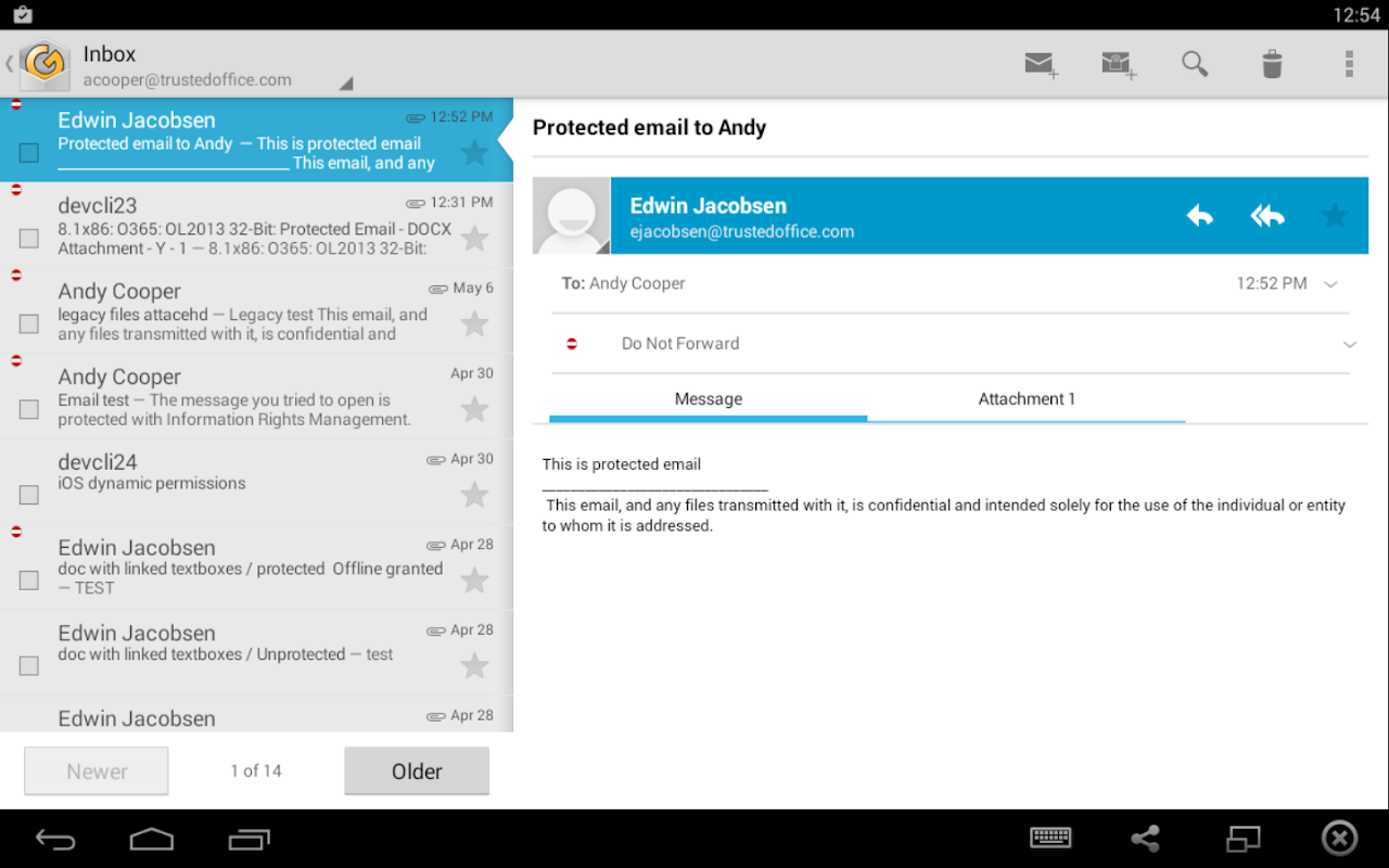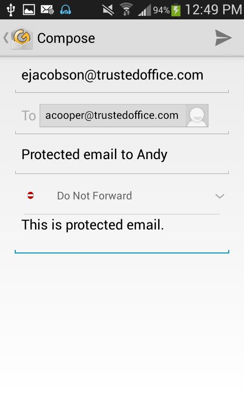 Unlike secure point-to-point messaging solutions that only protects content in transit, GigaCloud for Android protects content at rest, in transit and in use, allowing you to securely deliver and persistently protect emails and attachments while they are being read on the device. Android users can apply protection to outgoing email responses and messages as well. If email permissions allow forwarding, attachments remain protected whether they are accessed on the desktop or on another mobile device.
