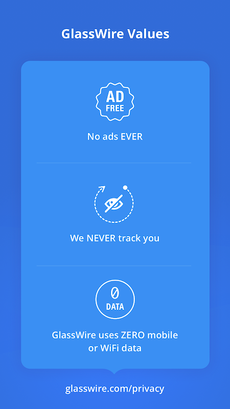 ซอฟต์แวร์ Windows และ Android ของเราถูกดาวน์โหลดรวมกันแล้วมากกว่า 20 ล้านครั้ง! เราสร้างรายได้จากการขายซอฟต์แวร์ GlassWire สำหรับ Windows ไม่ใช่จากการขายข้อมูลของคุณให้กับบุคคลที่สาม ด้วย GlassWire ข้อมูลและข้อมูลการใช้งานแอปของคุณจะไม่หลุดออกจากโทรศัพท์ของคุณ GlassWire จะไม่แสดงโฆษณาหรือละเมิดความเป็นส่วนตัวของคุณ