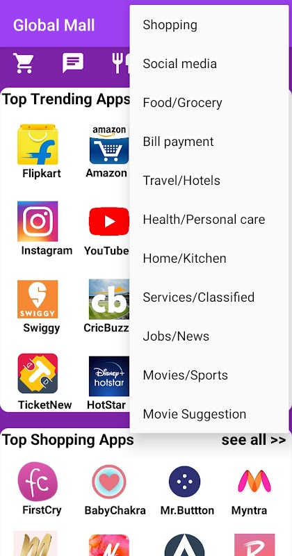 Global mall - Smart app store for android : Now you can save your android mobile RAM, MEMORY, BATTERY, & ALSO YOUR TIME. This app contain 100+ best app in play store. 100% safe, fast & secure.